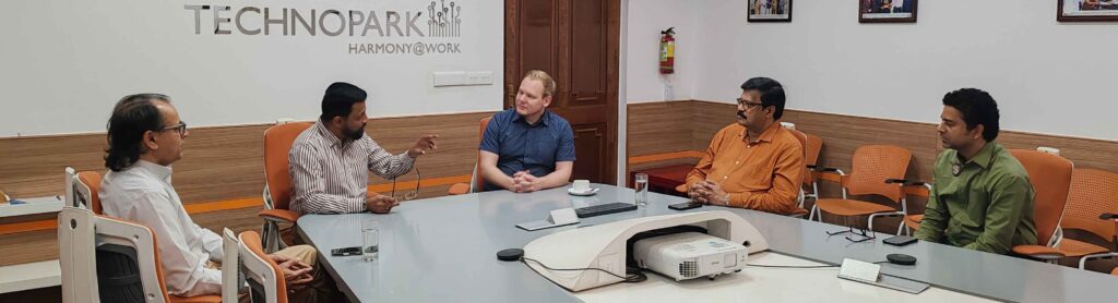 ജിടെക്കിന്റേയും ടെക്നോപാര്ക്കിലെ മറ്റ് കമ്പനികളുടേയും പ്രതിനിധികളുമായി ബാംഗ്ലൂരിലെ ജര്മ്മന് കോണ്സുലേറ്റ് ജനറലിലെ കോണ്സലും വിസാ വിഭാഗം മേധാവിയുമായ ജോനാസ് മൈക്കല് ടര്ക്ക് സംവദിക്കുന്നു. ടെക്നോപാര്ക്ക് സിഇഒ കേണല് സഞ്ജീവ് നായര് (റിട്ട), ഫെഡറല് റിപ്പബ്ലിക് ഓഫ് ജര്മ്മനിയിലെ ഓണററി കോണ്സലും ഗൊയ്ഥെ-സെന്ട്രം ഡയറക്ടറുമായ ഡോ. സയ്യിദ് ഇബ്രാഹിം, ജിടെക് സെക്രട്ടറിയും തിരുവനന്തപുരം ടാറ്റ എല്ക്സി സെന്റര് ഹെഡുമായ ശ്രീകുമാര് വി, ടെക്നോപാര്ക്ക് ഡെപ്യൂട്ടി വൈസ് പ്രസിഡന്റ് (മാര്ക്കറ്റിംഗ് ആന്റ് കസ്റ്റമര് റിലേഷന്ഷിപ്പ്) വസന്ത് വരദ എന്നിവര് സമീപം.
