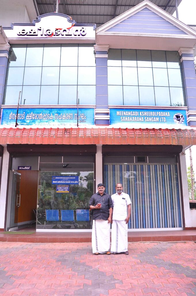 മികച്ച ക്ഷീര സഹകരണ സംഘത്തിനുള്ള ദേശീയ ഗോപാൽ രത്ന അവാർഡ് നേടിയ വയനാട് ജില്ലയിലെ മീനങ്ങാടി ക്ഷീരോല്പാദക സഹകരണ സംഘം പ്രസിഡന്റ് ജയന്‍ പി പി സെക്രട്ടറി മാത്യു കെ ബി എന്നിവര്‍ സംഘത്തിന് മുന്നിൽ