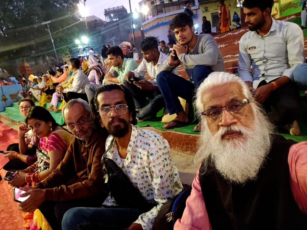 ഗംഗാ തീരത്ത് ആരതി വീക്ഷി ക്കുന്നവർ.ലേഖകൻ വി.വിജയൻ,മകൻ വി.ഗൌതമൻ,സുഹൃത്തും സെക്രട്ടേറിയറ്റിലെ റിട്ട.ഉദ്യോഗസ്ഥനുമായ ബി.പത്മസംഭവൻ എന്നിവർ മുൻനിരയിൽ