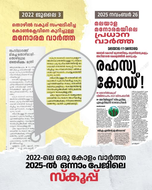 ഫെയ്സ് ബുക് കുറിപ്പിൻ്റെ പൂർണരൂപം:’ഇന്നലെ (2025 നവംബർ 26) മലയാള മനോരമയുടെ ഒന്നാം പേജിലെ പ്രധാന വാർത്ത “ലേബർ കോഡ്: മുന്നണിയും യൂണിയനുകളും അറിയാതെ കേരളത്തിൽ കരട് ചട്ടം – രഹസ്യ കോഡ്” എന്നായിരുന്നു. തൊഴിൽ മന്ത്രി അതീവ രഹസ്യമായി എന്തോ ചെയ്തുവെന്ന തരത്തിലായിരുന്നു അവതരണം.