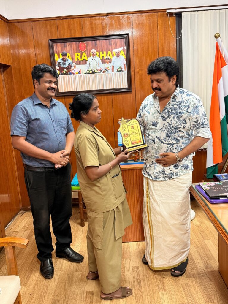 കെ എസ് ആർടിസി കൊട്ടാരക്കര ഡിപ്പോയിലെ കണ്ടക്ടർ കെ. രേഖയെ ഗതാഗതമന്ത്രി കെ.ബി ഗണേഷ് കുമാർ അനുമോദിക്കുന്നു