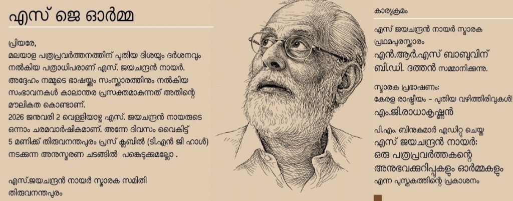 പി എം ബിനുകുമാർ എഡിറ്റ് ചെയ്ത ‘എസ്. ജയചന്ദ്രൻ നായ‍ർ ഒരു പത്രപ്രവർത്തക​ൻ്റെ അനുഭവക്കുറിപ്പുകളും ഓർമ്മകളും’ എന്ന പുസ്തകം ചടങ്ങിൽ പ്രകാശനം ചെയ്യും.