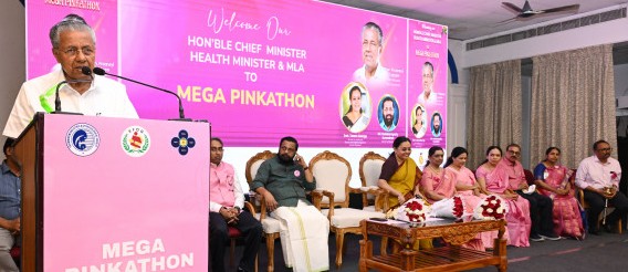 കേരള ഫെഡറേഷൻ ഓഫ് ഒബ്സ്റ്റട്രിക്‌സ് ആൻ്റ് ഗൈനക്കോളജിയുടെ ആഭിമുഖ്യത്തിൽ തിരുവനന്തപുരം മെഡിക്കൽ കോളേജ് ഓഡിറ്റോറിയത്തിൽ സംഘടിപ്പിച്ച മെഗാ പിങ്കത്തോൺ സ്തനാർബുദ ബോധവൽക്കരണ ക്യാമ്പയിൻ മുഖ്യമന്ത്രിഉദ്ഘാടനം ചെയ്യുന്നു.