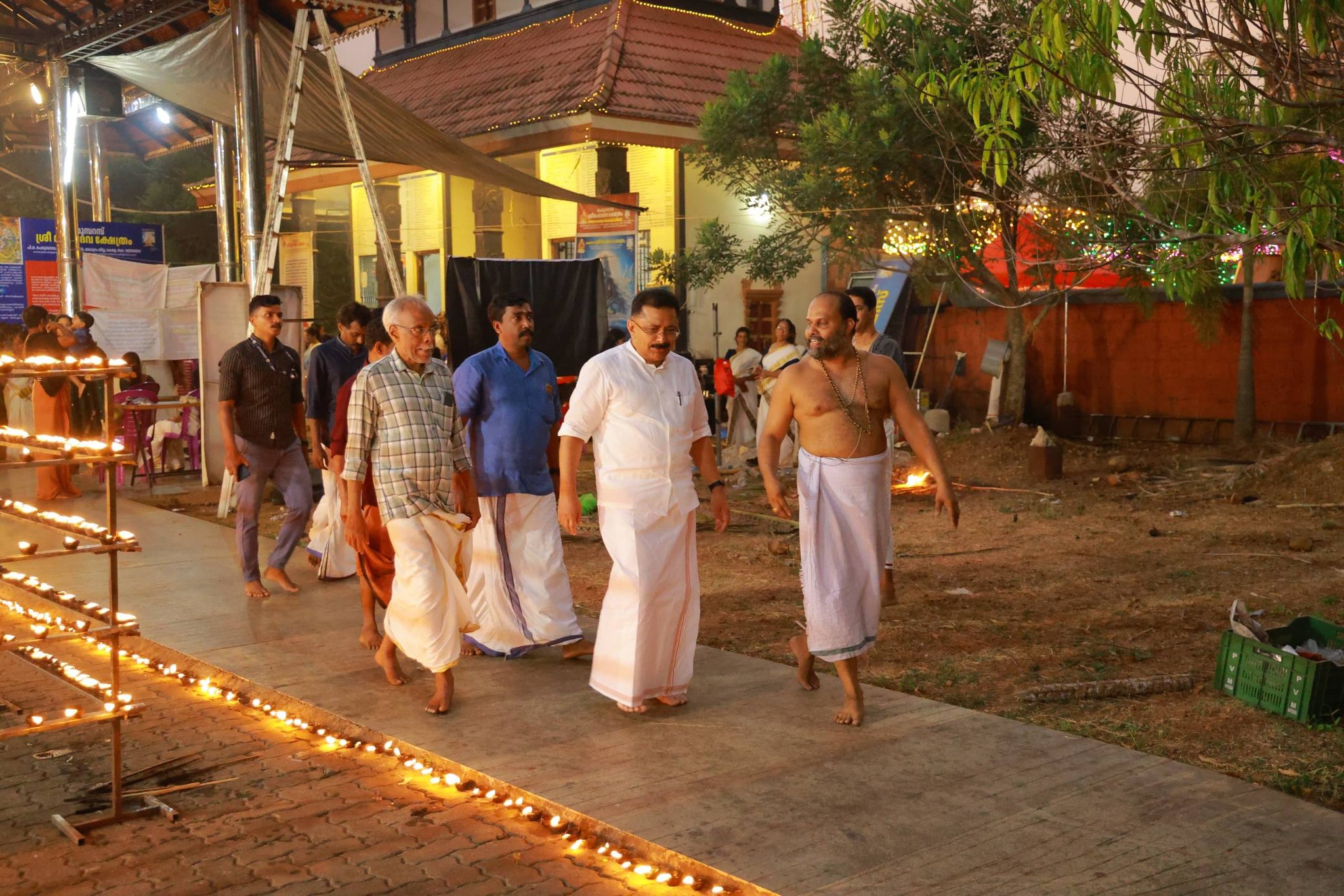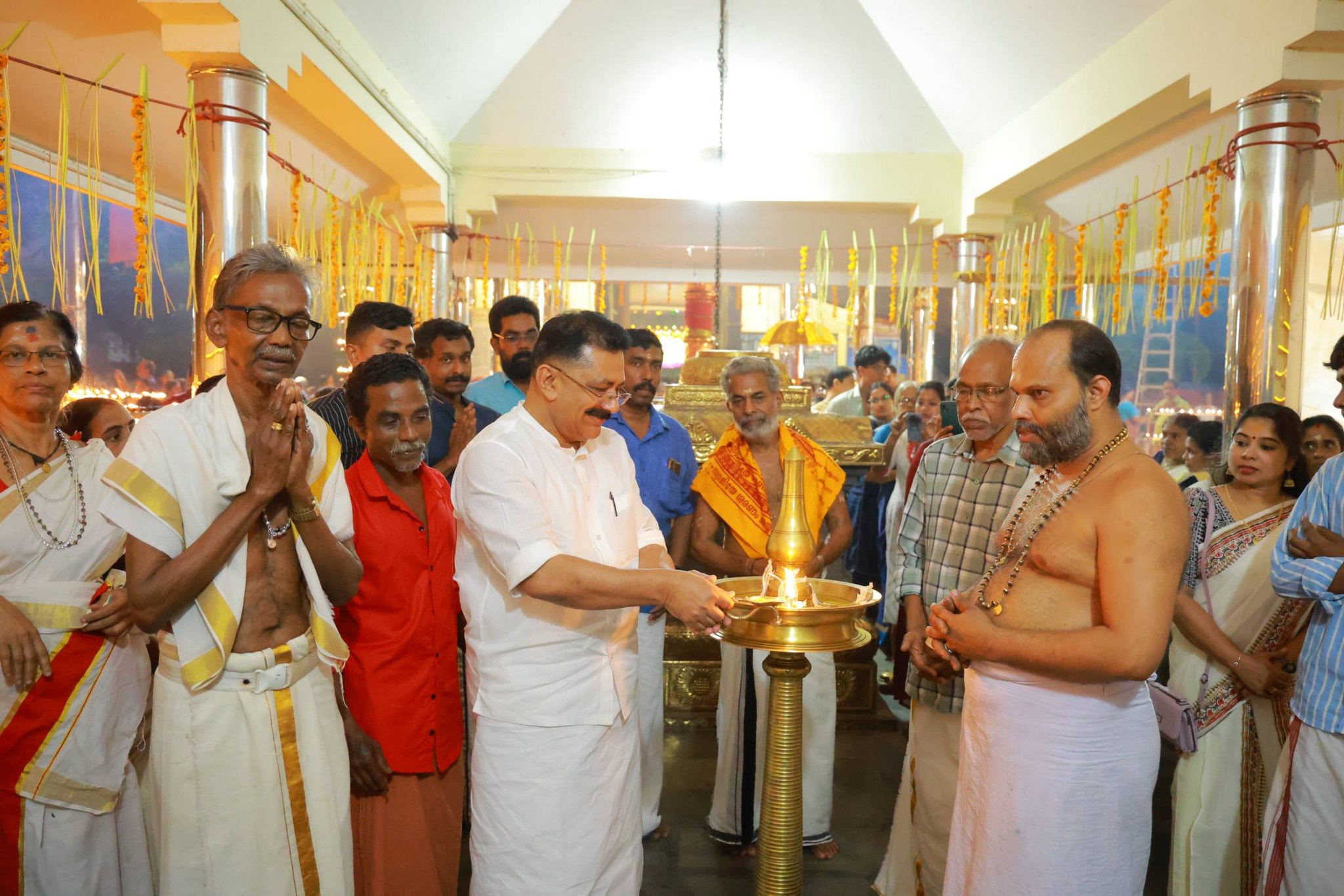 പെരുമ്പറമ്പ് മഹാശിവക്ഷേത്ര നടയിലെ കൂറ്റൻ നിലവിളക്കിലെ തിരി തെളിയിച്ച വിശിഷ്ടാതിഥി