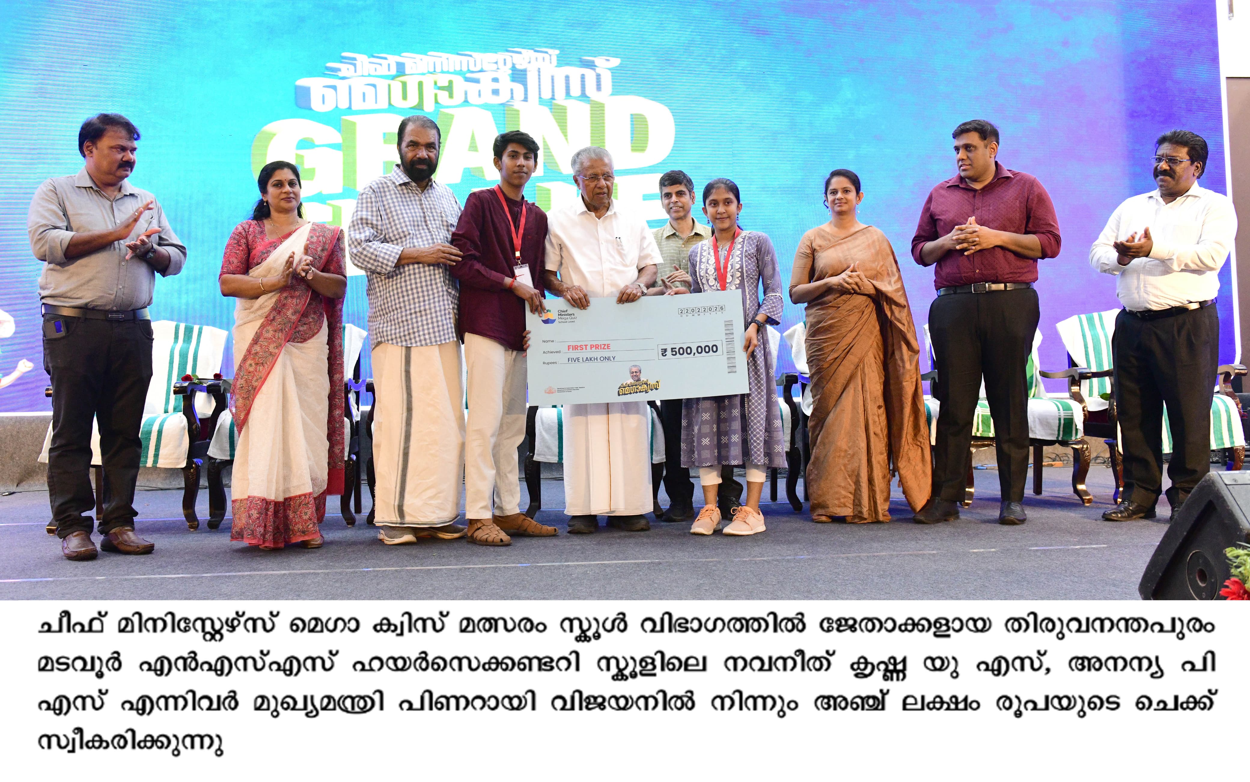 വഴുതക്കാട് ഗവ. വനിത കോളേജിൽ നടന്ന ചീഫ് മിനിസ്റ്റേഴ്‌സ് മെഗാ ക്വിസ് ഗ്രാന്റ് ഫിനാലെയിൽ കോളേജ് വിഭാഗത്തിൽ നിന്ന് 40 ഉം സ്‌കൂൾ വിഭാഗത്തിൽ 41 ഉം ടീമുകൾ പങ്കെടുത്തു. ജനുവരി 12 ന് സ്‌കൂൾ, കോളജ് തലങ്ങളിൽ തുടങ്ങിയ ചീഫ് മിനിസ്റ്റേഴ്‌സ് മെഗാ ക്വിസിൽ വിവിധ ജില്ലകളിൽ നിന്നും യോഗ്യത നേടിയ ടീമുകളാണ് ഗ്രാന്‍റ് ഫിനാലെയിൽ ഏറ്റുമുട്ടിയത്.