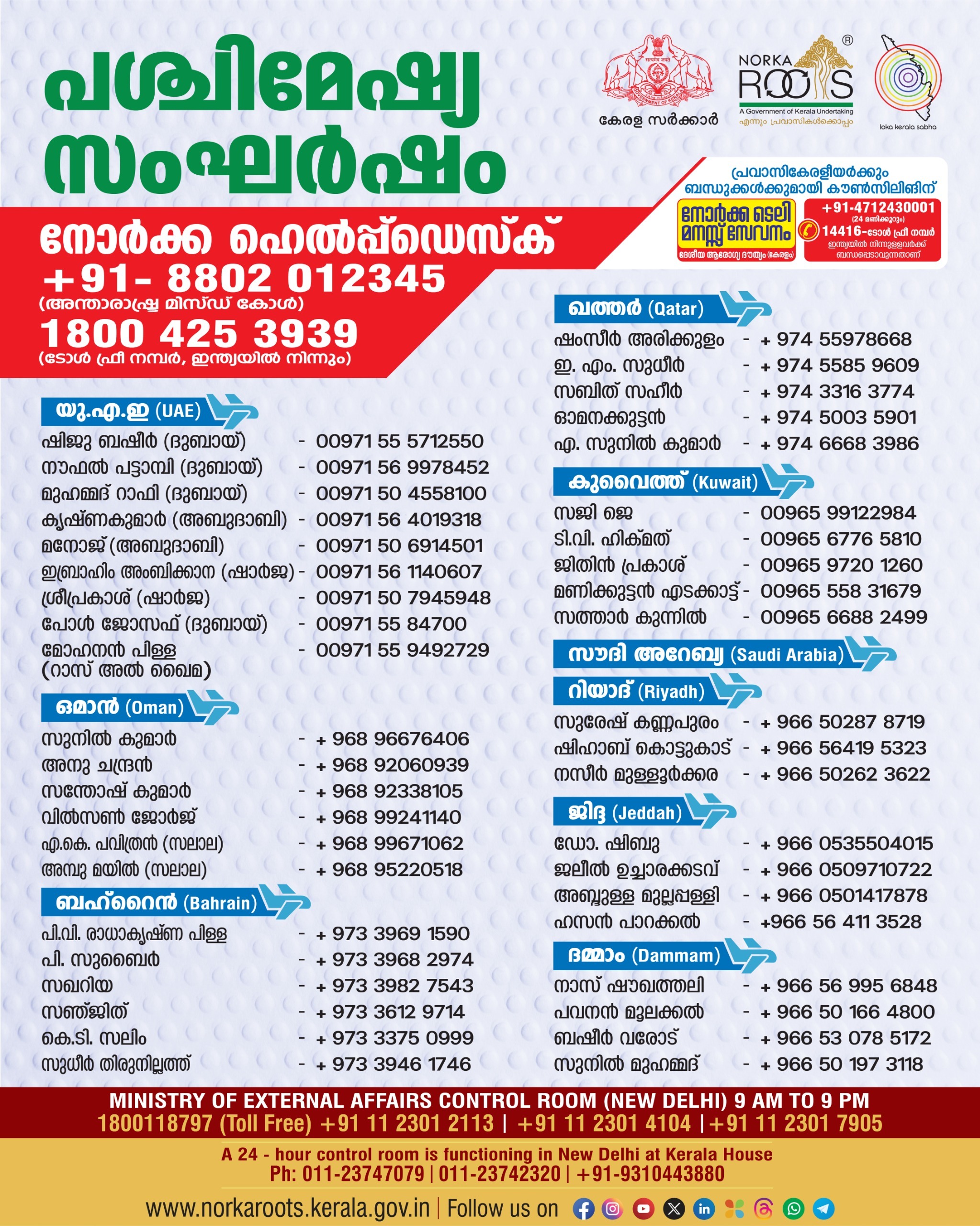 24 മണിക്കൂറും പ്രവര്‍ത്തിക്കുന്ന നോർക റൂട്ട്സ് ഹെൽപ്‌ഡെസ്ക് +91-8802012345 (അന്താരാഷ്ട്ര മിസ്ഡ് കോൾ), 18004253939 (ടോൾ ഫ്രീ നമ്പർ, ഇന്ത്യയില്‍ നിന്നും) ന്യൂഡൽഹി കേരള ഹൗസ് കൺട്രോൾ റൂം (011-23747079, 011-23742320, +91-9310443880) എന്നിവയ്ക്കു പുറമേ നോര്‍ക്ക സെന്ററില്‍ എല്ലാ ദിവസവും രാത്രി 10 മണി വരെ പ്രവര്‍ത്തിക്കുന്ന കണ്‍ട്രോള്‍ റൂമും സജ്ജമാക്കിയിട്ടുണ്ട്. കേന്ദ്ര-സംസ്ഥാന സര്‍ക്കാര്‍, കേന്ദ്ര വിദേശകാര്യ മന്ത്രാലയം, ഇന്ത്യന്‍ മിഷനുകള്‍ എന്നിവരുമായുളള ഏകോപനത്തിനാണ് കണ്‍ട്രോള്‍ റൂം. കേന്ദ്ര വിദേശകാര്യ മന്ത്രാലയം കണ്‍ട്രോള്‍ റൂം 9 AM to 9 PM 1800118797 (Toll Free), +91 11 2301 2113, +91 11 2301 4104, +91 11 2301 7905.