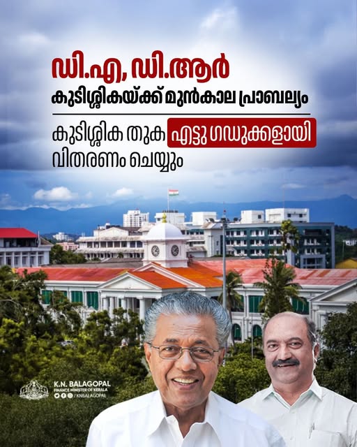സംസ്ഥാന സർക്കാർ ജീവനക്കാർക്കും പെൻഷൻകാർക്കും നൽകേണ്ട മുഴുവൻ ഡി.എയും ഡി.ആറും ഇതിനകം അനുവദിച്ചു. എന്നാൽ, ഇങ്ങനെ അനുവദിച്ച ഡി.എയുടെയും ഡി.ആറിൻ്റെയും കുടിശ്ശിക ഘട്ടംഘട്ടമായി വിതരണം ചെയ്യുമെന്ന് ധന മന്ത്രി കെ.എൻ ബാലഗോപാൽ ഇത്തവണ ബജറ്റിൽ പ്രഖ്യാപിച്ചിരുന്നു. 2026-27 സാമ്പത്തിക വർഷത്തിൽ നിശ്ചയിച്ച കുടിശ്ശിക ഗഡുക്കളുടെ വിതരണത്തിനായുള്ള തുകയും ബജറ്റിൽ വകയിരുത്തിയിട്ടുണ്ട്.