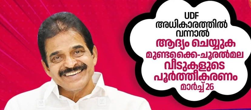 ⚫️ മാർച്ച് 26-ന് എല്ലാവരെയും അത്ഭുതപ്പെടുത്തിക്കൊണ്ട് കെ.സി. വേണുഗോപാൽ ഒരു പ്രസ്താവന നടത്തുന്നു- യുഡിഎഫ് അധികാരത്തിൽ വന്നാൽ ആദ്യം ചെയ്യുക മുണ്ടകൈ-ചൂരൽമല വീടുകളുടെ പൂർത്തീകരണമായിരിക്കും.