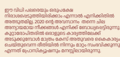 ‘നിയമത്തിന്റെ മുന്പില് എല്ലാ പൗരന്മാരും തുല്യരല്ല എന്ന തിരിച്ചറിവിന് നന്ദി’യെന്ന് അതിജീവിത