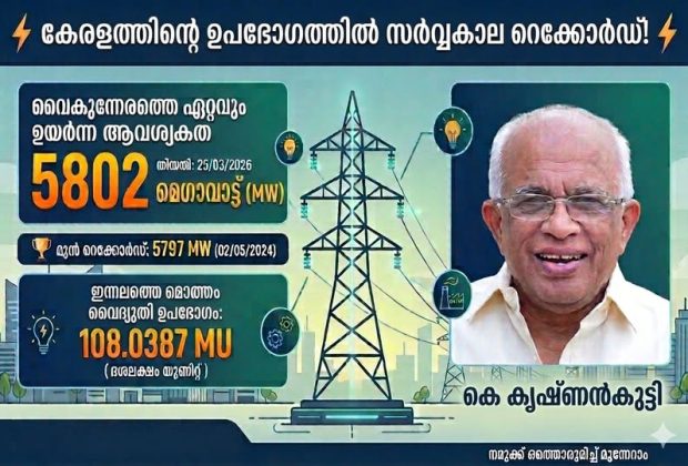 മാർച്ച് 25ന് 5,802 മെഗാവാട്ടിൻ്റെ വൈദ്യുതി ഉപഭോഗ റെക്കോർഡ് തിരുവനന്തപുരം:ചൂട് കൂടിയതോടെ സംസ്ഥാനത്ത് വൈദ്യുതി ഉപഭോഗം സർവകാല റെക്കോർഡിൽ.മാർച്ച് 25ന് 5,802 മെഗാവാട്ടിൻ്റെ കുതിപ്പിലെത്തി.ഇതിനുമുമ്പത്തെ റെക്കോർഡ് ഉപഭോഗം 2024 മെയ് 2 ലെ 5,797 മെഗാവാട്ട് ... -